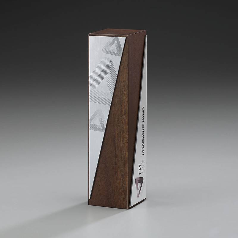 Ein "Cubix" aus massivem Nussbaum-Holz und 2 Metallauflagen mit einer Stärke von 1,5 mm. Das dynamische Design macht diesen Award zu einem absoluten Blickfang!