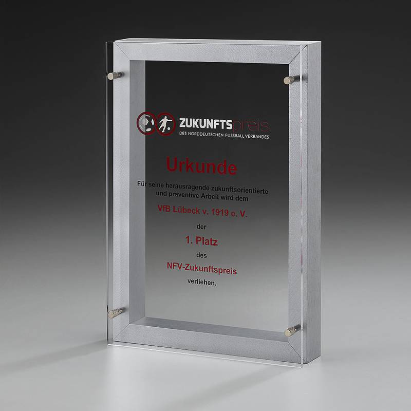 Leichtigkeit und pure Eleganz werden in diesem Award vereint. Ein 33 mm tiefer, silberfarbener Holzrahmen, versehen mit einer aufgelegten Acrylplatte. Ein herrlicher Award.