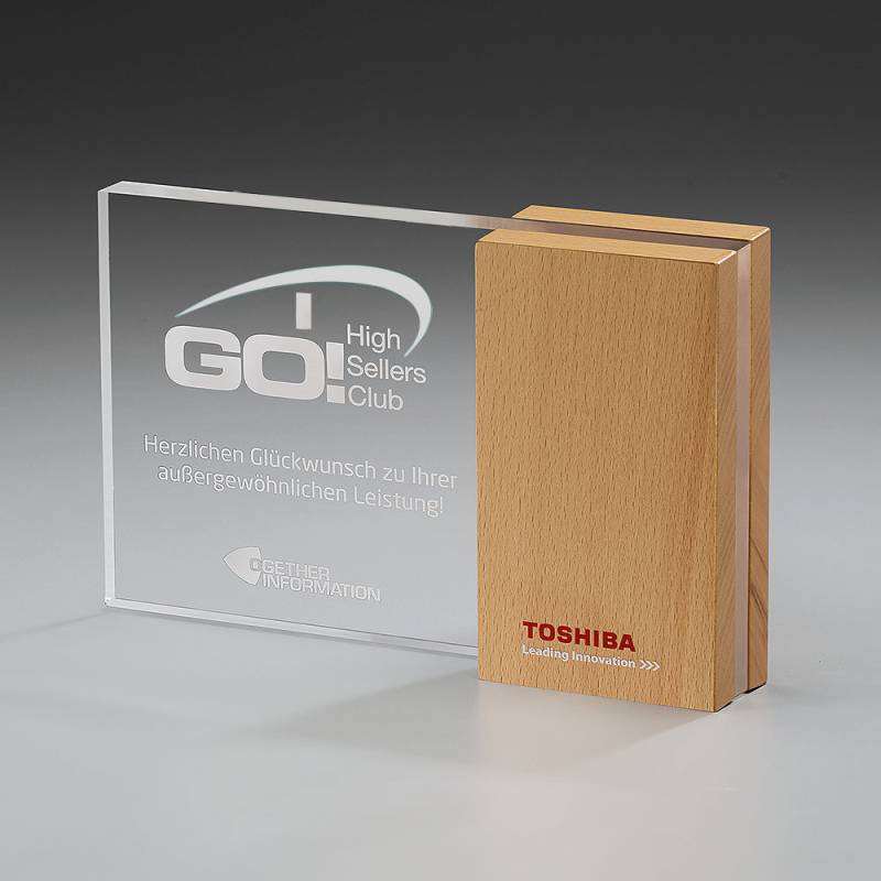 Ein raffinierter Award! 10 mm starke Acrylplatte kombiniert mit 15 mm starken Massivholz-Elementen. Das Buchenholz stammt aus nachhaltiger Forstwirtschaft.