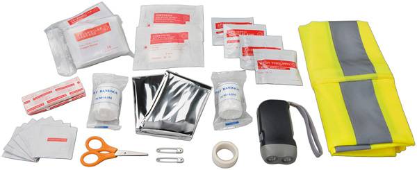 Mullbinden, Dreieckstücher, div. Kompressen, verschiedene Pflaster, Alkohol-Pads, Sicherheitsnadeln, Schere, Dynamo-Taschenlampe, Kälteschutzdecke und Warnweste, zusammen in einem Hartschalen-Etui mit RV und Tragegriff.