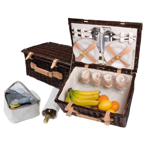 Picknickkoffer aus Weidengeflecht für 4 Personen mit herausnehmbarem Kühlfach, Flaschenkühler, Kunststoffgläsern, Porzellantellern, 12-teiligem Besteck und Kellnermesser aus Metall. Ihre Werbung wird mittels Etikett aus Papier außen angebracht.