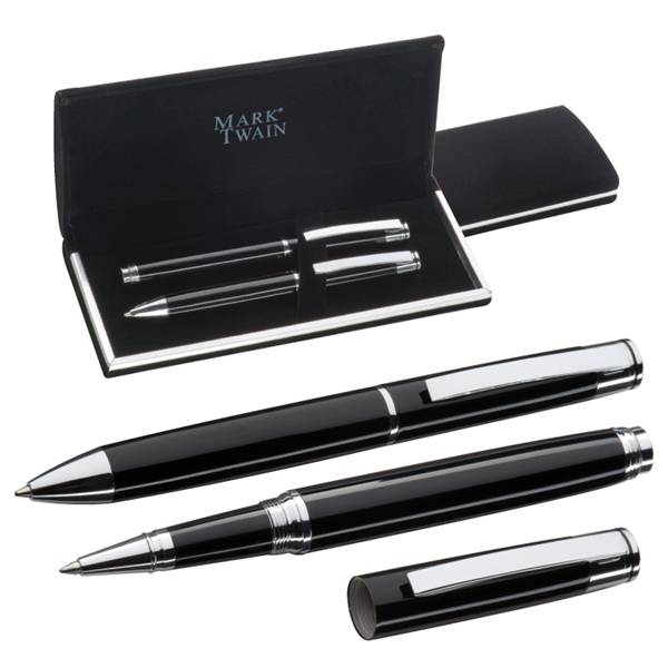 Mark Twain Schreibset "Montgomery" in schwarzem Veloursetui mit massivem Drehkugelschreiber und Tintenroller (beide blauschreibend) in eleganter schwarzer Lackierung. Ihre Werbung gravieren wir auf den Clip der Schreibgeräte.