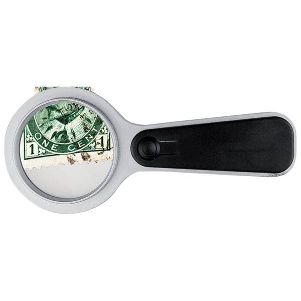 Lupe aus Kunststoff mit eingebauter weißer LED. Damit können Sie sogar in der Nacht alles unter die Lupe nehmen. Der breite Griff eignet sich hervorragend für einen Werbedruck in silber.