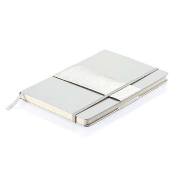 Größe A6, mit silbernem Papiersleeve, schwarzem Seitenteiler und Gummiband, runde Ecken, innen 80 gelbe Seiten, liniert, 80g/m² Papier.