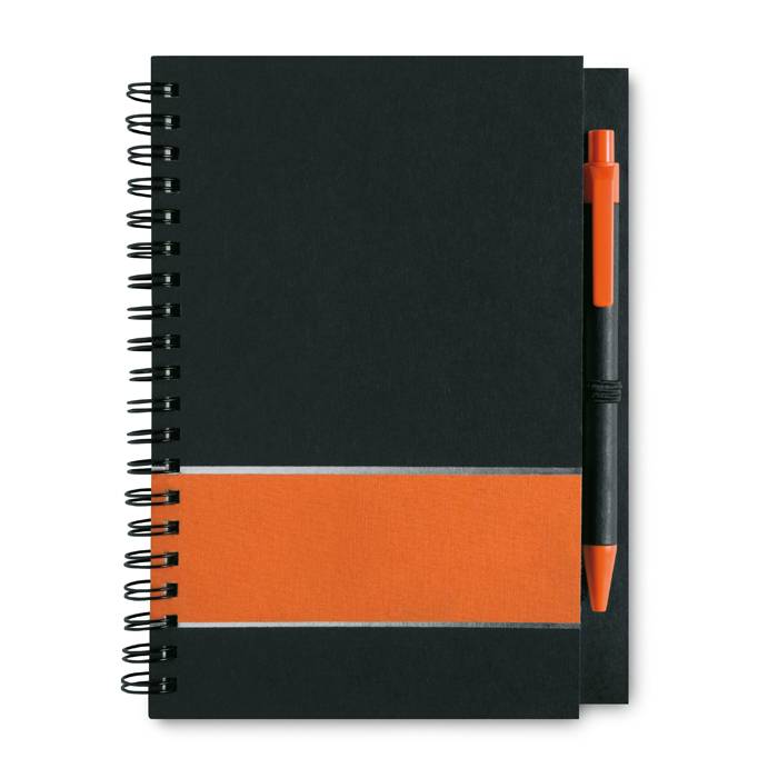 Linierter Schreibblock mit Spiralbindung. Eingebunden in schwarzen Karton in verschiedenen Farbausführungen. 70 Blatt. Inklusive Kugelschreiber mit blauer Tinte. Farbe: orange. Anfragen über info@takutrends.de