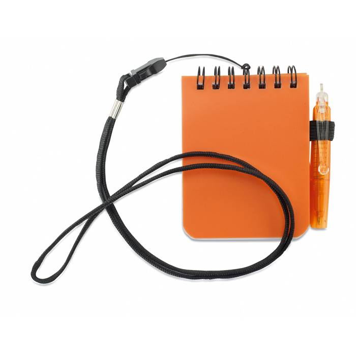 60-seitiges Notizbuch mit Spiralbindung, Inklusive Kugelschreiber und Umhängeband. Blaue Tinte. Farbe: orange. Anfragen über info@takutrends.de