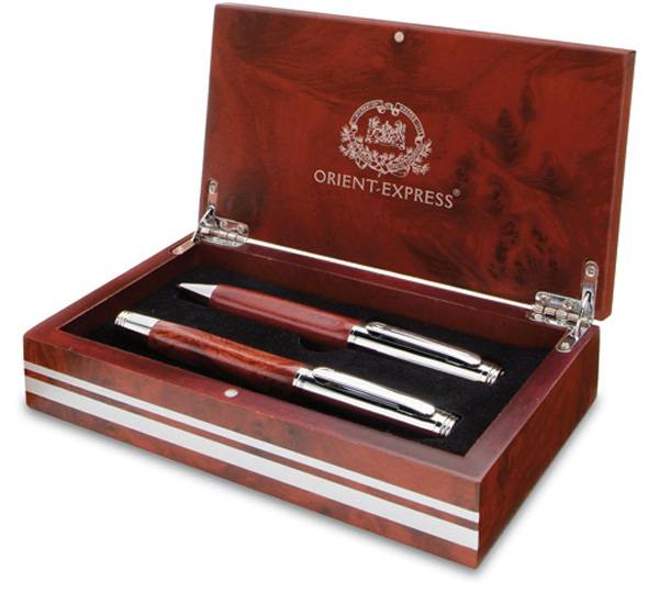Drehkugelschreiber mit großer Metallmine und Rollerball in einer hochwertigen Kunstleder-Schatulle in Krokooptik.