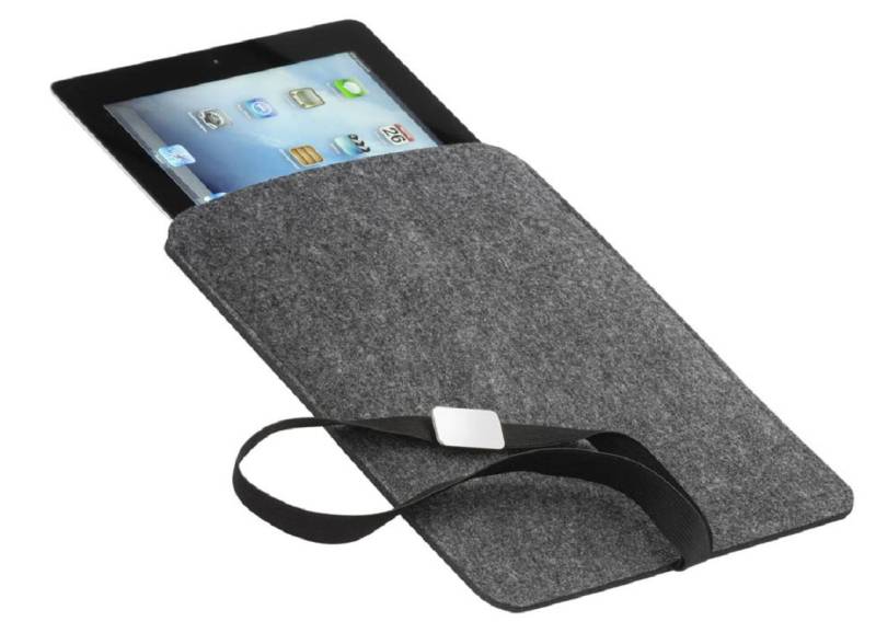 FILZTASCHE TO-GO für den Tablet PC mit elastischem Fixierband und Metallplakette zur Veredelung ( 3,2 x 2,2cm ). Maße 27,5 x 21,5 x 0,6cm. VE 120/60 Stück.