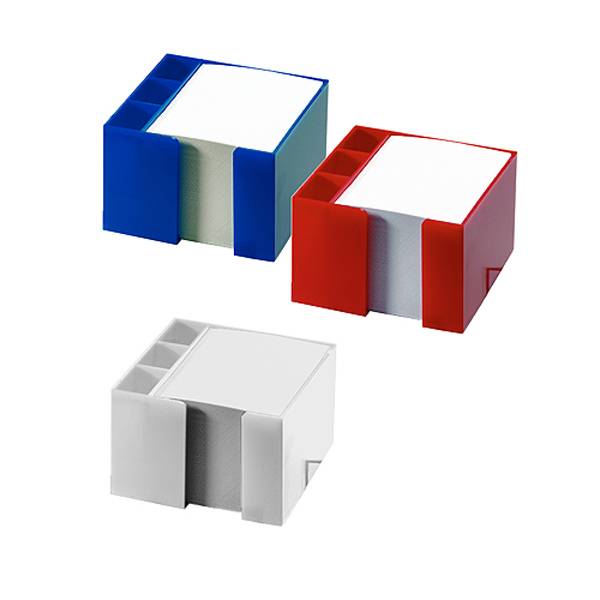 Praktisch auf jedem Schreibtisch. Zettelbox mit 3 extra Fächern zum Aufbewahren von Stiften und anderen Schreibutensilien. Befüllt mit umweltfreundlichem Recyclingpapier.
