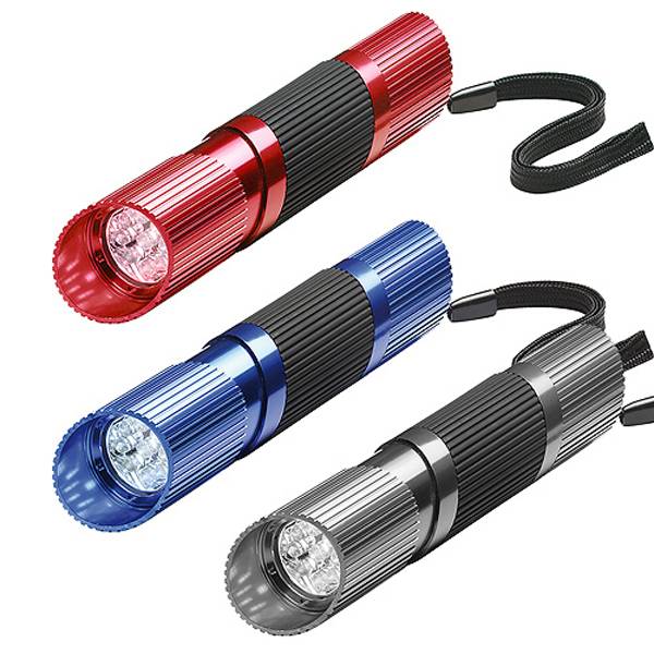 LED-Taschenlampe aus Aluminium mit gummiertem Griff und Handschlaufe. Durch Vor- und Zurückschieben des Kopfendes wird die Lampe ein bzw. ausgeschaltet.
