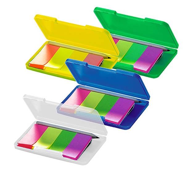 Universalbox mit neonfarbenen Haftnotizstreifen und 1 kleinen Holz-Bleistift. Mit Klickverschluss.