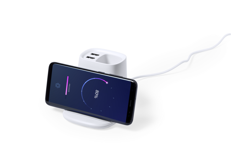 4 in 1 - Multifunktionsstift, aus strapazierfähigem ABS-Material in Weiß. Mit Stiftfunktionen, Smartphone-Halterung, kabellosem 5-W-Ladegerät und 2 USB-2.000-mA-Ausgängen. Unterer USB-Anschluss, geeignet für die Datenübertragung. Kompatibel mit Smartphones mit kabelloser Ladetechnik. Inklusive 1 Meter langem Typ-C-Kabel und in attraktiver Designerbox. Gebrauchsanweisung in Englisch und Spanisch verfügbar.