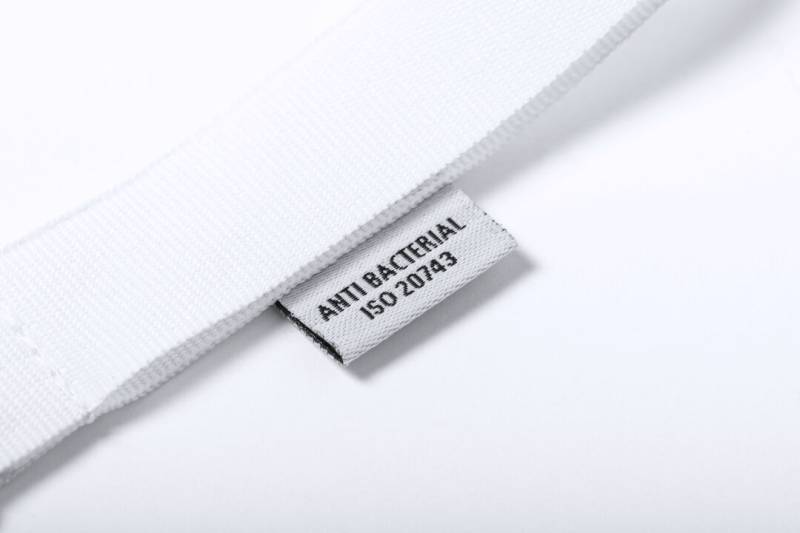 Antibakterielles Schlüsselband aus weißem Polyester mit Metallkarabiner. Produkte mit antibakteriellen Behandlungen sind in der Lage, die auf den Materialoberflächen vorhandenen bakteriellen Belastungen drastisch zu reduzieren, dank der Einbindung statischer, permanenter mikrobieller Wirkstoffe, mit hoher Wirksamkeit zur Hemmung und Verhinderung bakterieller Kontamination. Artikel nach der Norm ISO 20743, der die antibakterielle Aktivität in Textilprodukten bestimmt, was erlaubt, die Wirksamkeit der mikrobiellen Hemmung, die die Zusatzstoffe auf den behandelten Objekten haben, durch eine quantitative Bewertung zu kennzeichnen. Antibakterielle Kennzeichnung auf dem Etikett.