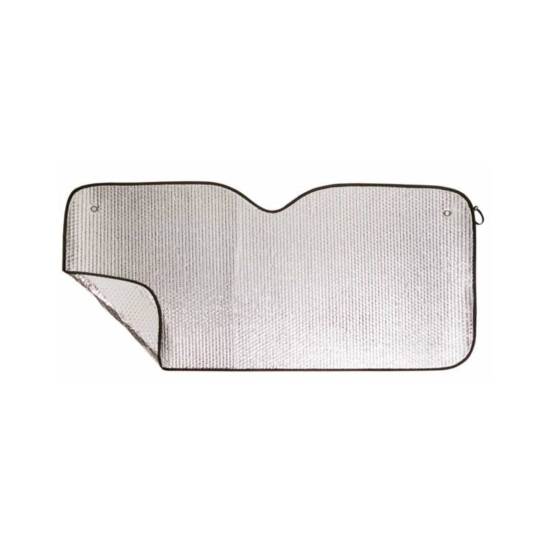 Sonnenschutz aus Aluminum in Silber-Metallic mit schwarzer Paspel. Mit den Maßen 130 x 60 cm, Gummibändern zum Fixieren im gefalteten Zustand, Metallösen zur Verstärkung, sowie zwei Saugnäpfen für die Befestigung an der Windschutzscheibe. Präsentiert in ungefaltetem Zustand für einfaches Bedrucken.