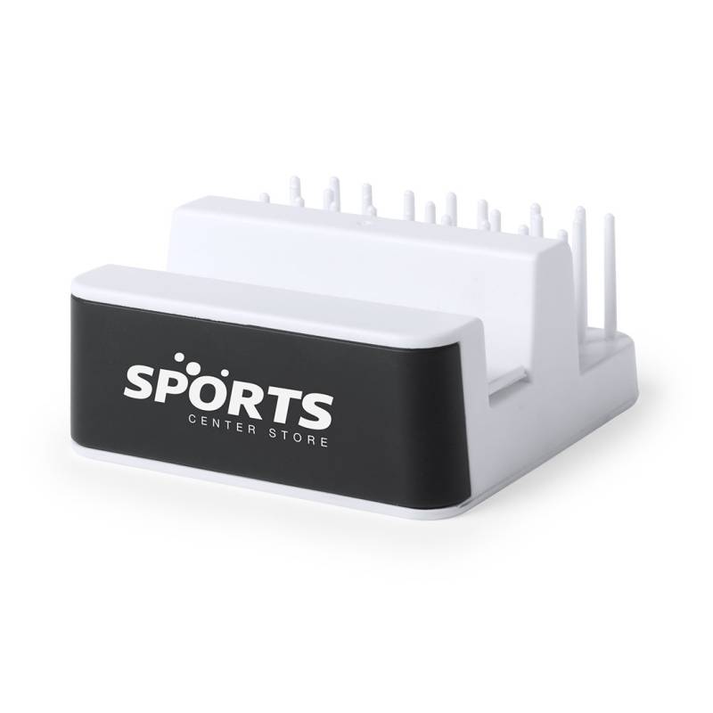 Halterung für Smartphone oder Tablet mit minimalistischem Design in Weiß und Fach auf der Rückseite. Mit speziell für den Laserdruck entwickelter Druckfläche auf der Vorderseite, durch die Ihre Werbung oder Marke mit weißem Licht beleuchtet wird.