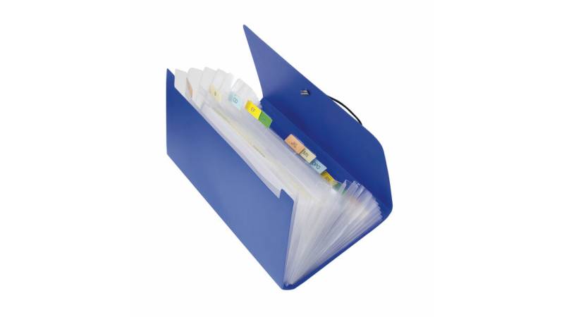 Mappe mit raffiniertem Gummizugverschluss. Hergestellt aus widerstandsfähigem Material in verschiedenen Farben. Im Inneren mit 12 halbtransparenten Trennern mit Identifikationslaschen.