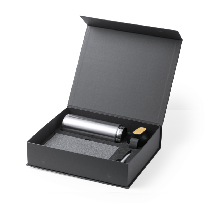 Elegantes Premium-Set, bestehend aus:Doppelwandiger Thermobecher aus rostfreiem Stahl. 640 ml Fassungsvermögen, mit Bambusfläche auf dem Deckel für das Branding. Weicher PU-Notizblock mit integriertem Smartphone-Halter auf dem Deckel und Bambusfläche für das Branding. Inklusive Gummiverschluss, Lesezeichen und farblich passendem Stifthalter. Innen mit 80 Einstreifen-Layoutblättern. Aluminium-Kugelschreiber in matter Ausführung mit Bambusfläche für das Branding, Drehmechanik und blauer Tinte. Präsentiert in einem individuellen, mattierten Etui mit Magnetverschluss, einschließlich Innenstanzung für jedes Element des Sets.