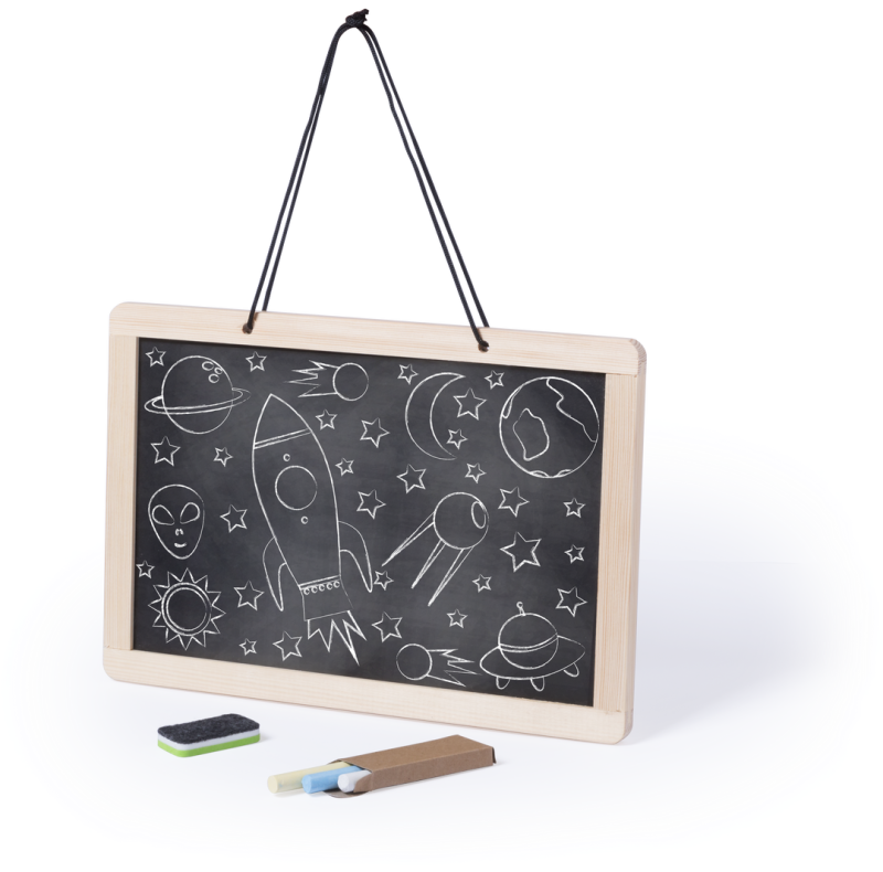 Beidseitig nutzbare Tafel zum Aufhängen, mit 2 verschiedenen Seiten: traditionelle Kreidetafel mit 3 Kreidestücken auf einer und Whiteboard mit Marker auf der anderen Seite. Mit doppelseitigem Radiergummi für Kreide und Marker.