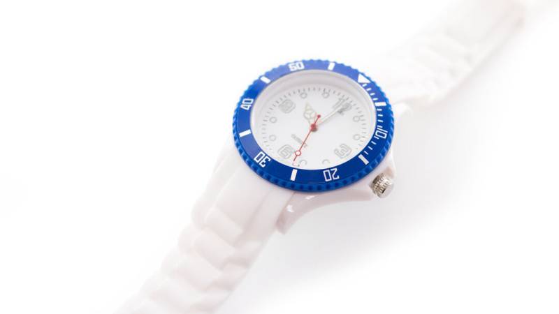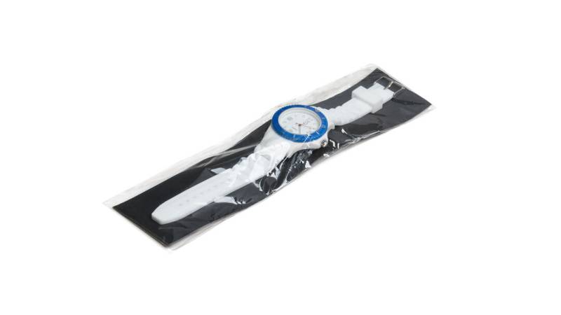 Chronograph-Armbanduhr in origineller zweifarbiger Ausführung. Mit Chronograph in fröhlichen Farben, analogem Zifferblatt und Silikonarmband in Weiß. Spritzwassergeschützt. Präsentiert in einem individuellen Beutel.