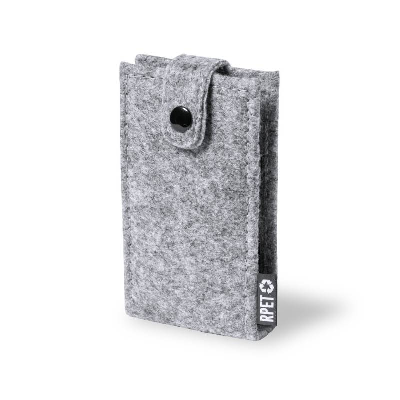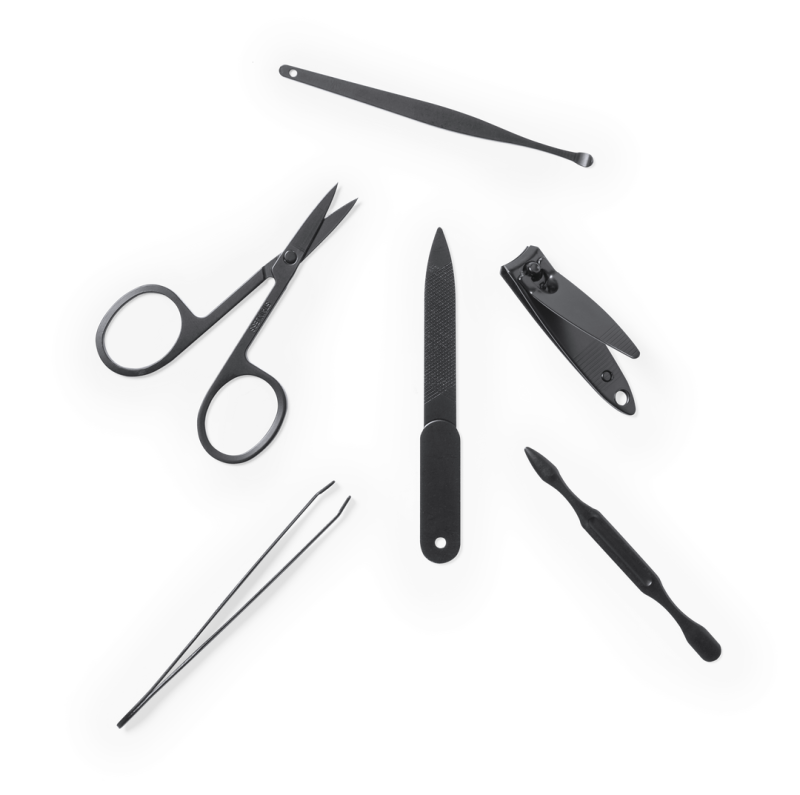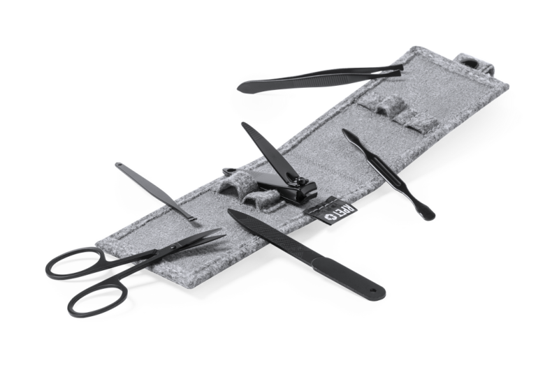 Maniküre-Set mit 6 Accessoires, mit Etui aus widerstandsfähigem RPET-Filz, das Ergebnis der Kombination des Recycling-Prozesses von Kunststoffen mit der tausendjährigen Technik der Filzherstellung, wodurch ein Öko-Trend-Material entsteht, das nicht nur recycelt wird, sondern auch wiederverwertbar ist. Metallzubehör aus rostfreiem Stahl mit schwarzem Finish: Schere, Pinzette, Nagelknipser, Nagelfeile und 2 Nagelhautentferner. Mit Knopfverschluss und unverwechselbarem RPET-Etikett auf der Außenseite.