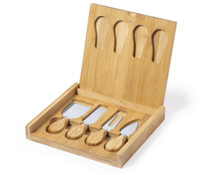 Originelles Käseset in einer Faltschachtel mit rechteckiger Form und Stanzungen für jedes Zubehör. Zubehör aus rostfreiem Stahl mit Bambusgriff. Präsentiert in einer individuellen Kraft-Design-Box.