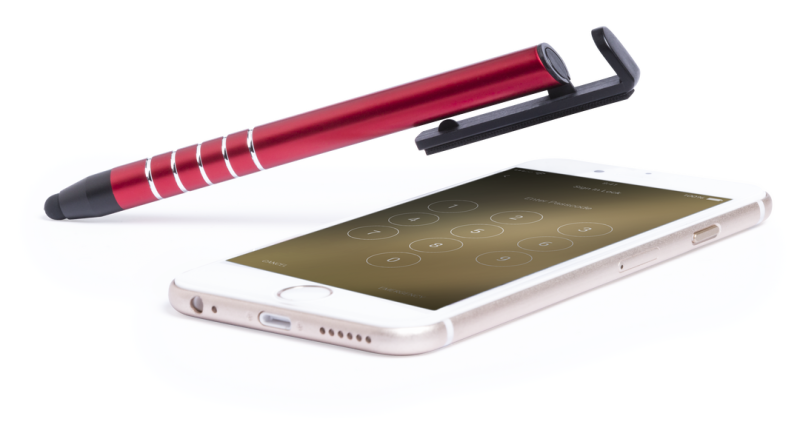 Druck-Kugelschreiber mit Ständer für Mobilgerät und im Clip integriertem Displayreiniger. Mit geschmeidigem Aluminiumschaft mit angenehm anzufassender Oberfläche in lebendigen Metallic-Farben. Blaue Tinte.