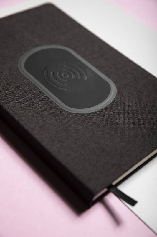 Notizblock aus robustem 300D Polyester mit schlichtem Design und integriertem, kabellosem Ladegerät. Ladestation auf dem Cover. Mit 80 linierten Blättern.