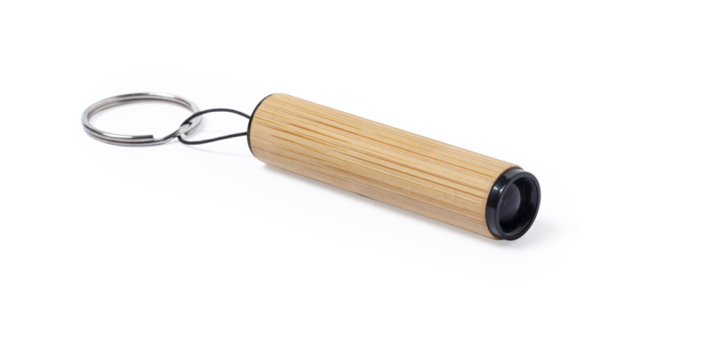 Linie "Natur" Schlüsselanhänger aus Bambus mit einer Naturtaschenlampe. 1 LED, batteriebetrieben (Knopfzellen im Lieferumfang enthalten) und präsentiert in einer individuellen Designtasche.
