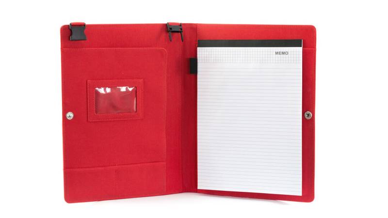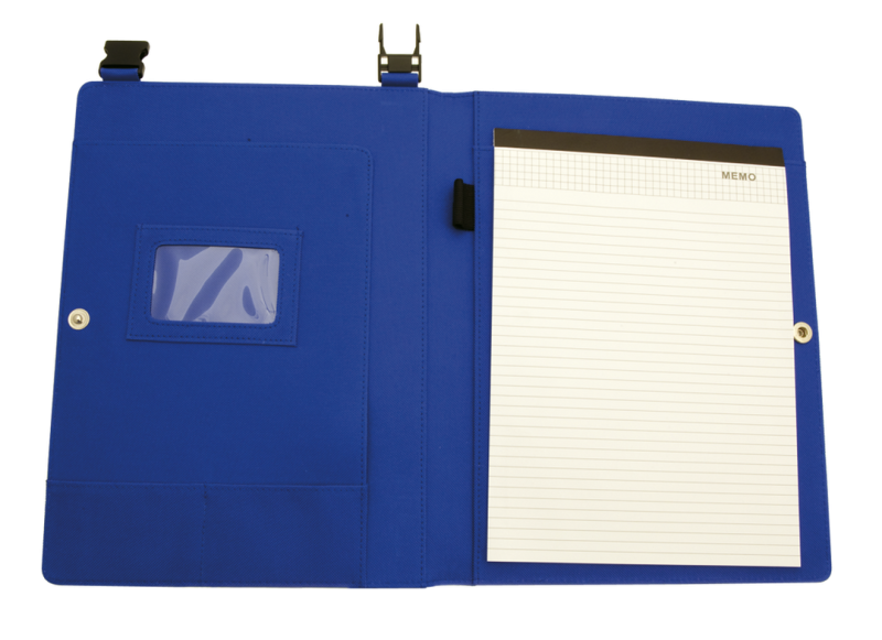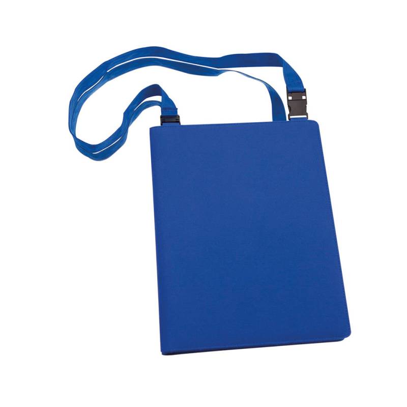 Originelle 600D Polyester-Mappe mit abnehmbarem Schultergurt. Mit herausnehmbarem Block mit 20 Blättern und Klappentasche sowie Kartenfächern und Stifthalter.