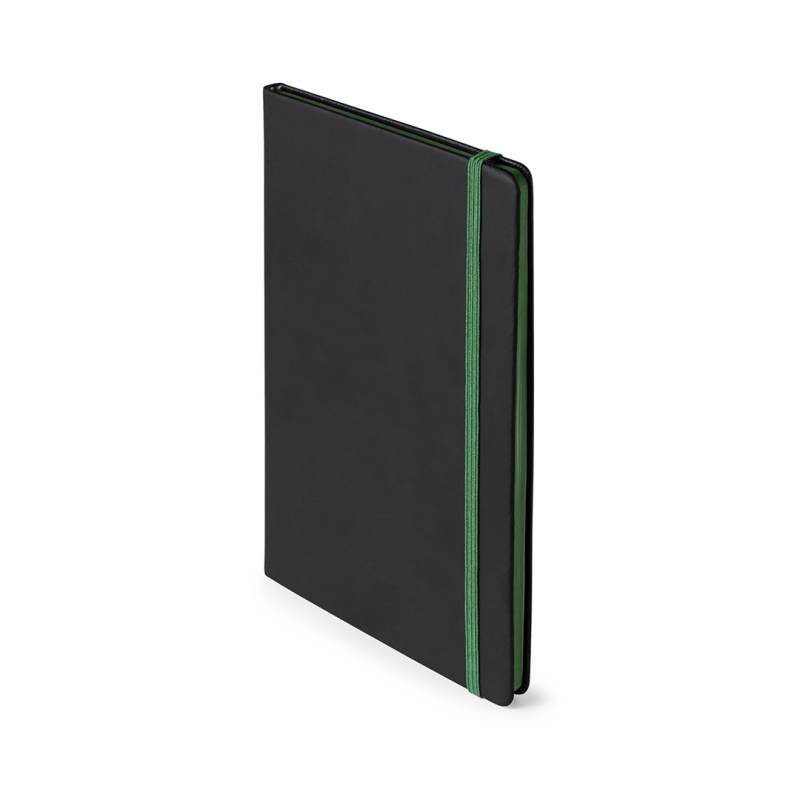 Notizblock mit Soft-Touch-Cover aus elegantem schwarzem Kunstleder. Mit 80 Blättern mit Kanten in lebhaften Farben, Gummibandverschluss und farblich passendem Lesezeichenband.