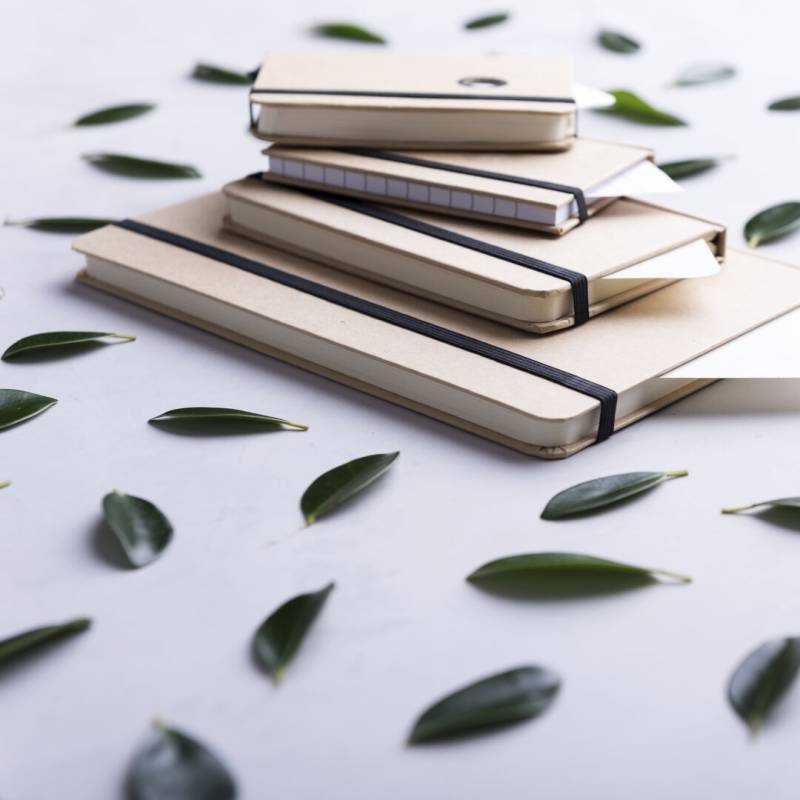 Notizblock mit Soft-Touch-Cover aus robustem Karton in Naturfarbe. Mit 100 Blättern, Gummibandverschluss und farblich passendem Lesezeichenband.