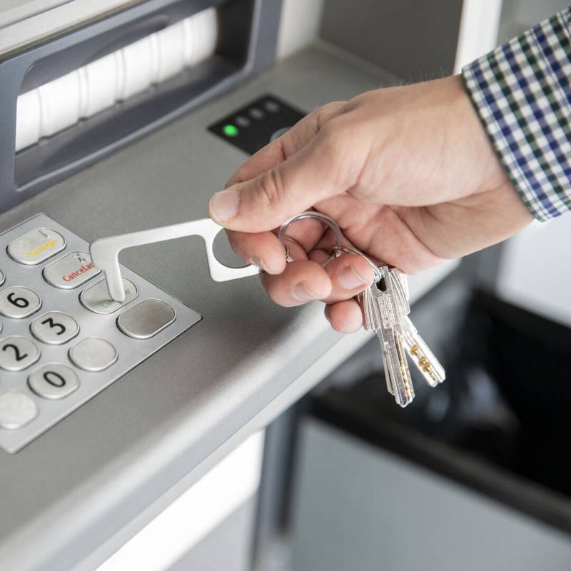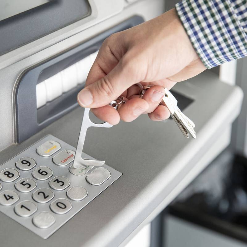 Hygienischer, berührungssicherer Sicherheitsschlüsselanhänger aus widerstandsfähigem Edelstahl. Speziell entwickelt, um das Berühren von Oberflächen im öffentlichen Bereich mit den Händen zu vermeiden (Türgriffe, Schalter, Wasserhähne im öffentlichen Bereich, Geldautomaten...). Mit komfortablem Ausschnitt für den Finger und in einer individuellen Tasche präsentiert. Empfohlen für Laserdruck.