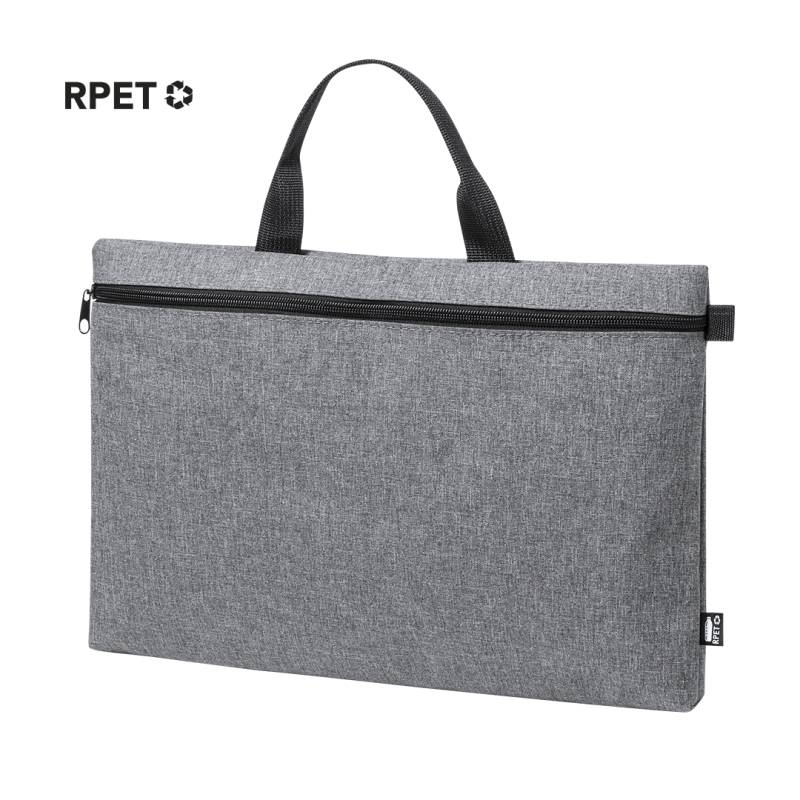 Dokumentenhalter der Natur Line und in widerstandsfähigem 600D RPET Melange-Effekt, hergestellt aus recyceltem Kunststoff, um die Wiederverwendung von Kunststoffabfällen zu fördern und zur Nachhaltigkeit des Planeten beizutragen. Schwarze Details und Hauptfach mit Reißverschluss. Stabile, passende Griffe und RPET-Plakette auf dem Außenetikett.