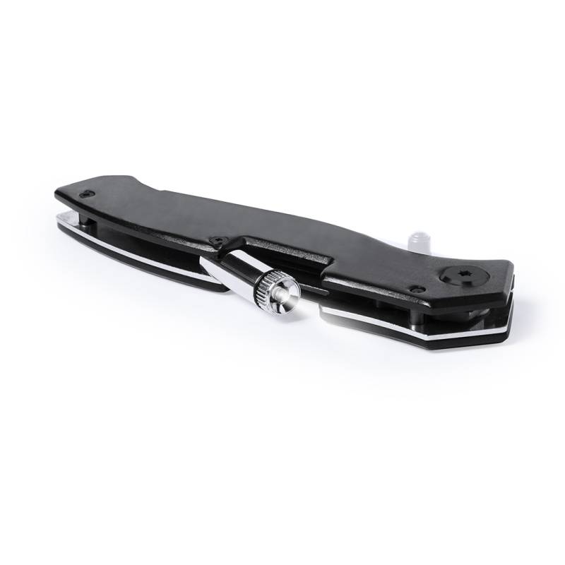 Messer von Orizons aus Edelstahl. Mit robustem, rutschfestem Griff mit Sicherheitsverschluss sowie integrierter Mit LED-Taschenlampe und Stanzung am Griff. Knopfzellen inklusive. Präsentiert in einer individuellen Box mit dem Markenlogo.