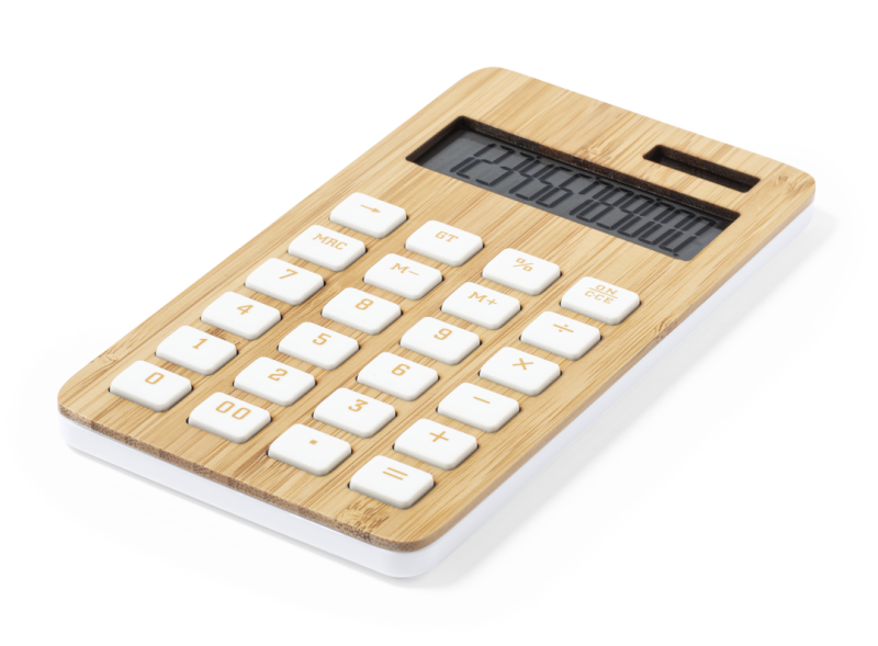 Linie "Natur" 12-Tasten Taschenrechner aus Bambus. Solarbetrieben, mit Zusatzbatterien (Knopfzelle enthalten). Mit automatischer Abschaltung und Softtouch-Tasten aus Silikon. Präsentiert in einer attraktiven Öko-Design-Box. Inkl. Bedienungsanleitung in Englisch und Spanisch.