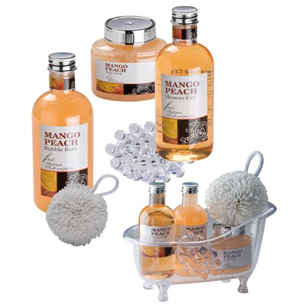 5-teiliges Pfirsich-Mango Badeset in einer kleinen Acrylwanne mit Duschgel (280ml), Schaumbad (280ml), Körperpeeling (220ml), Badeschwamm (EVA) und Massagehilfe aus Acryl. Ihre Werbung wird mittels bedrucktem Papieretikett auf dem Set angebracht.