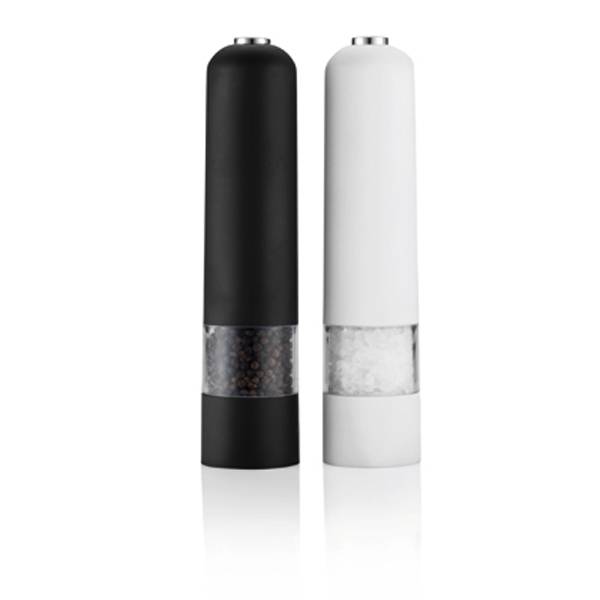 Elektrische Salz- und Pfeffermühle mit weißer bzw. schwarzer Gummibeschichtung, inkl. einstellbarem Keramikmahlwerk, konfektioniert in modischer, weißer Geschenkbox mit Magnetverschluss.