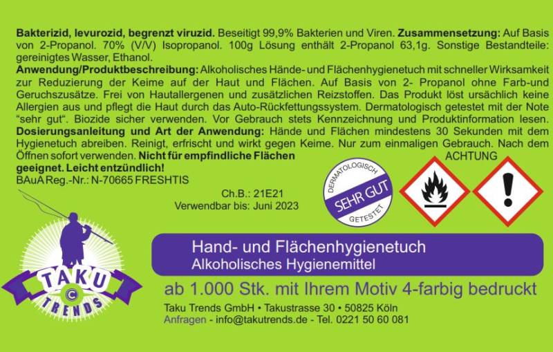 Das Desinfektionstuch wurde dermatologisch mit "Sehr gut" bewertet. Unser Desinfektionstuch unterliegt einer Kennzeichnungspflicht als Biozidprodukt, daher steht Ihnen bei der individuellen Gestaltung nur die Vorderseite zur freien Verfügung.
