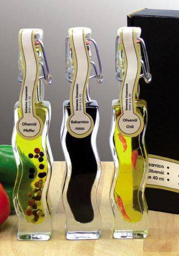 Verpackung: 3 schicke Designerflaschen mit Bügelverschluß. schwarzer Präsentkarton.