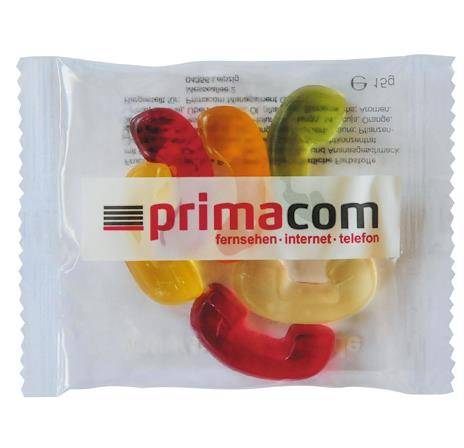 Fruchtgummi in Form eines Telefon Hörers. Ideal für Telekommunikations Unternehmen. 10 oder 15 Gramm Tütchen mit Ihrem Logo-Druck.