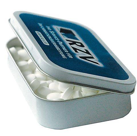 Werbeartikel Pfefferminz in der Nostalgiedose. Die leckeren Vivil Friendship ohne Zucker. Das perfekte Präsent auf Messen.