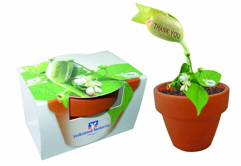 Das kleine Tontöpfchen mit Erdtablette und der Bohne mit dem wachsenden Slogan ist ein ideales Giveaway mit Botschaft. Für Ihren Werbeaufdruck ist viel Platz auf der Banderole.