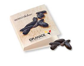 Klappkärtchen mit 3 Stück Tonka-Bohnen im transparenten Tütchen