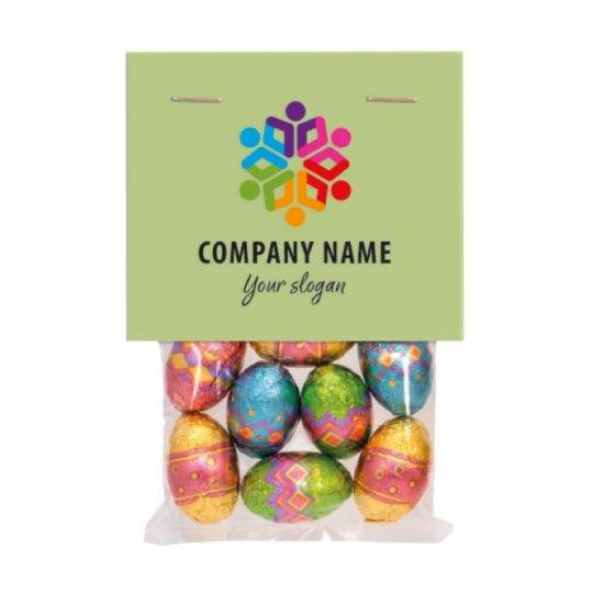 1 Beutel mit 8 feinsten Schoko-Eiern aus Vollmilchschokolade, bunt sortiert, 50 g. • Verpackt in einem Folientütchen mit Standardmotiv 4c „Happy Easter“. Mögliche Individualisierung: Reiter mit 4c-Digitaldruck.