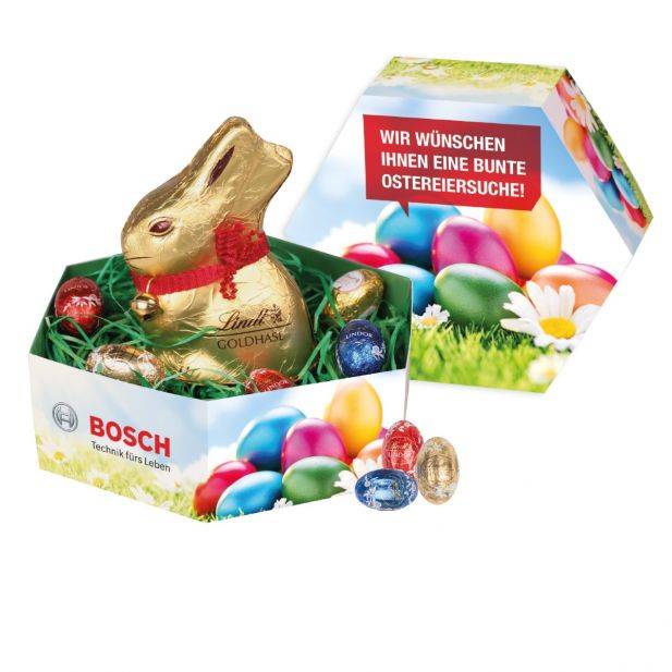 Unser Oster-Highlight mit dem Goldhasen! Dieses exklusive Osternest findet garantiert einen Ehrenplatz in den Büros Ihrer Kunden! Der unendlich zartschmelzende Goldhase von Lindt mit echtem Glöckchen und die süßen Lindt-Schokoladeneier sorgen für höchsten Genuss