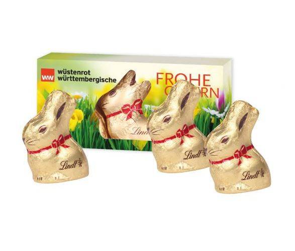Lindt Hasenparade als Werbeartikel Ostern. Der Goldhase von Lindt: Unser Star an Ostern! Gleich drei zartschmelzende Goldhasen sind in einer neuen Hasenparade versteckt! Ideal zum Teilen im Büro oder für Zuhause. Die Verpackung bietet eine optimale Werbefläche und ist rundum individuell bedruckbar