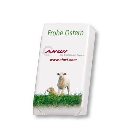 Süsse-Werbe-Ideen gehören zur Osterzeit. Schon deshalb werden es Ihnen Ihre Kunden mit viel Sympathie danken, wenn Sie sie mit feinsten Schokotäfelchen überraschen. Wir bieten Ihnen dazu den österlichen Stimmungsfaktor, denn wir umhüllen die gute Vollmilchschokolade mit einer Folie, auf die wir nicht nur Ihre Firmenwerbung, sondern auch jeweils ein schönes Ostermotiv drucken. 7 Motive stehen Ihnen zur Wahl.
