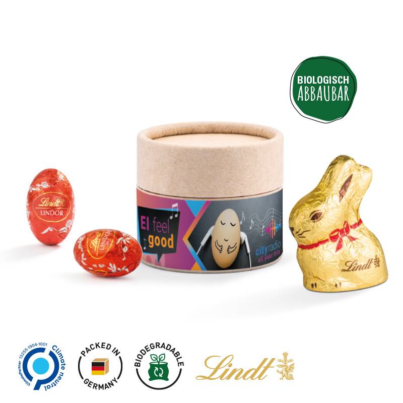 Lindt Schokoladen Ostereier und Osterhase in Papierdose biologisch abbaubar aus schnell nachwachsenden Rohstoffen, rundum mit Papieretikett, klimaneutral, individuell bedruckt