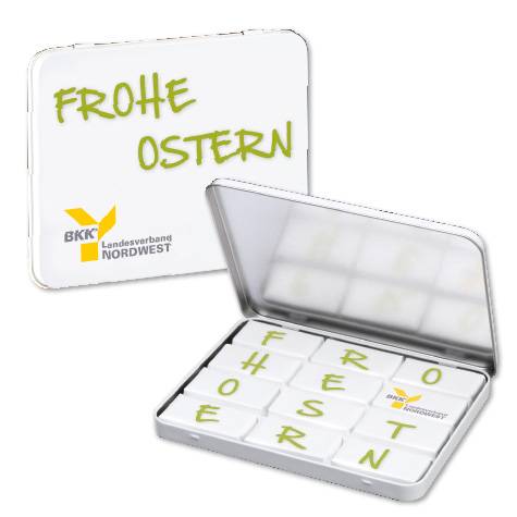 In der Dekordose befinden sich 12 Schokoladentäfelchen. 11 Täfelchen in richtiger Folge in die Dekordose gelegt, ergeben die Botschaft "Frohe Ostern". Auf das zwölfte Täfelchen drucken wir Ihr Firmenlogo. Den Deckel der Dosen bedrucken wir ganz nach Ihren Wünschen auch vollflächig in Ihren Firmenfarben. Wir legen die feinen 4,6g Schokoladentäfelchen geordnet oder ungeordnet in die Dose. Mit Ihrer Werbebotschaft puzzeln und danach feinste Vollmilchschokolade genießen: darin liegt der Werbe-Erfolg der Schokoladentafel-Werbe-Puzzle.