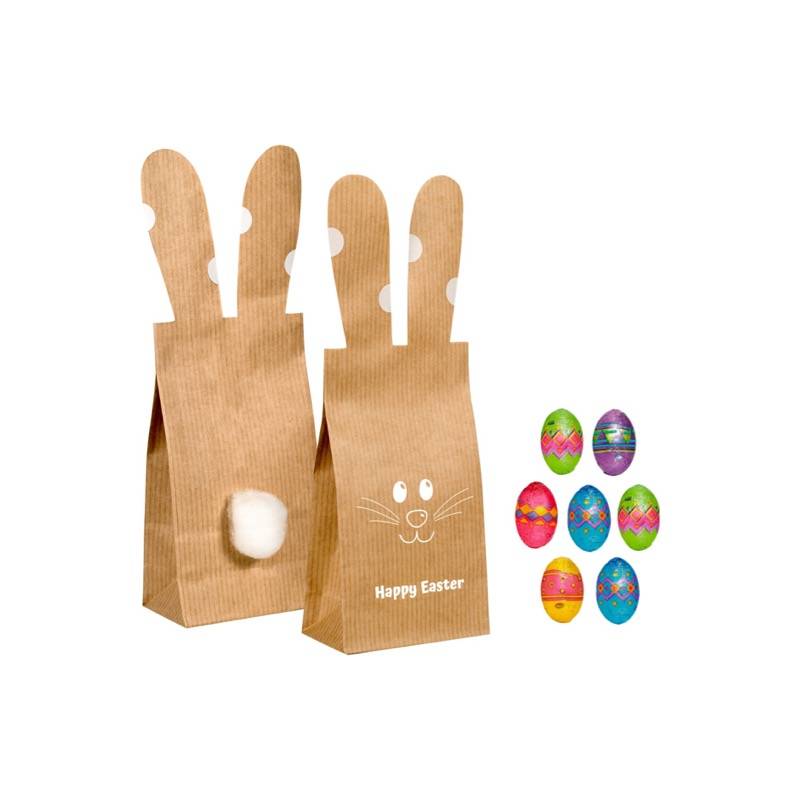 1 original Bunny Bag Osterhasen-Papiertüte mit Standardmotiv 1c „Happy Easter““, gefüllt mit 7 bunten Schoko-Ostereiern je 6,3 g.